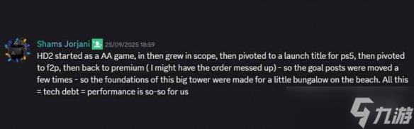 据GamesRadar+报道,乔贾尼在游戏Discord频道分析性能问题时表示:"《绝地潜兵2》最初是AA级项目,随后扩展规模,先转型为PS5首发作品,又调整为免费模式,最终回归买断制(顺序可能记忆有误)。"他坦言:"由于目标多次变更……导致这座高塔的地基原本只是为海滨平房设计的。所有这些因素累积成技术债务,造成当前性能表现不尽如人意。"