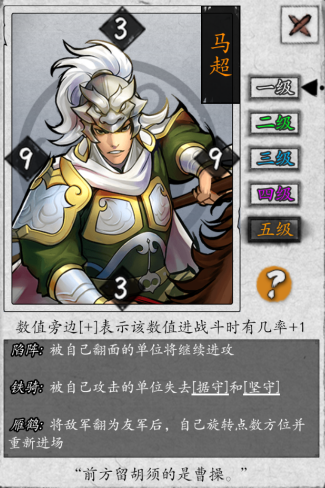 马超的强力之处在于,二级获得的第一技能【陷阵】能够在马超攻击后,形成连锁,带动被翻面的单位继续攻击。然后,在获得第二技能【铁骑】后,马超能无视【据守】、【坚守】技能,然带有此类技能的单位防无可防。在获得第三技能【雁鹤】后,马超甚至能在将敌军翻面后旋转自己的技能重新进场,更增加了自身的灵活性。
