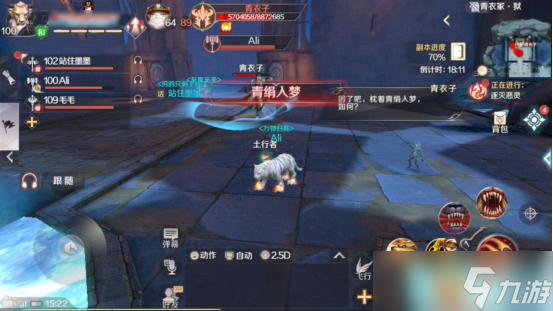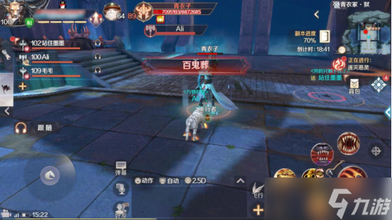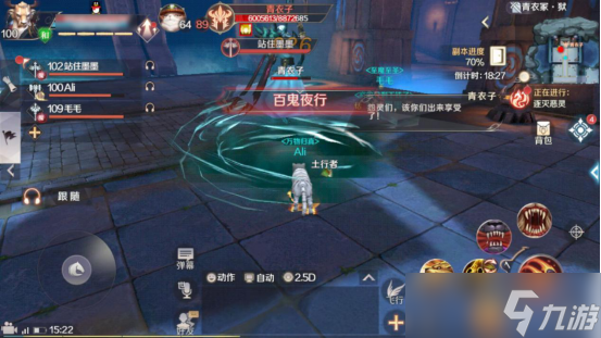 百鬼夜行则是青衣子在附近召唤一群小鬼,小鬼会对我们发起进攻。在青衣子释放此技能时,妖兽使用风火轮对青衣子发起进攻,即可吸引小鬼的仇恨。小鬼比较脆,比较容易消灭。