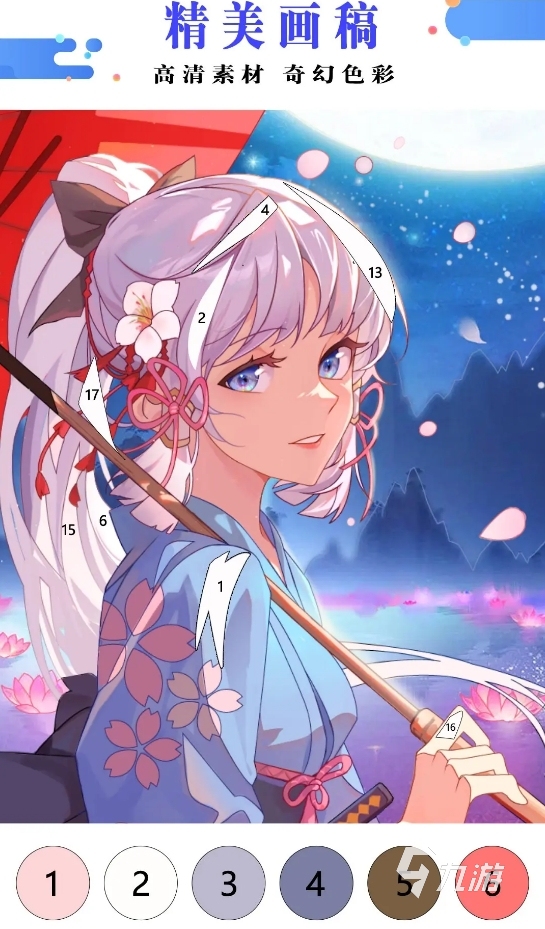 模式很简单的绘画填色游戏,绘本上各区域都会标注数字,且这些数字与颜色对应,各位选好颜色后按标注的数字来填色,即可在全部颜色都填完后成功完成自己的画作。里边的画作样式丰富,可爱的动物、二次元角色和气韵出众的古风都可在此作里找到,人们在体验它时,也能任意选择自己想尝试的画作来进行体验,不用像闯关那样需按既定顺序来挑战,绘好后还可将画作存下来。