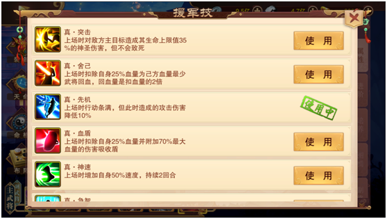 玩家需要根据自己的阵容选择援军武将,比如选择许褚进行收割,比如选择华佗进行治疗,又或者是周瑜进行控制,然后再根据这个援军武将的特点,选择援军技能,改变战场的走向。