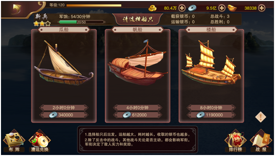漕运是一个出船,然后抢粮与被抢的玩法,这个玩法本身其实是有策略的。从船只的选择上来说,小船虽然收益少,但是时间短,每小时的收益还大于大船,所以如果有精力的话,白天应该押运小船,晚上睡前再押运大船。