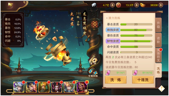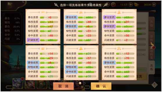 专属洗炼中,总的资质是固定的,玩家需要根据自己的需要,选择分配到最合适的属性上去。洗炼不仅每日有免费次数,还可以从其他系统的商店中获得大量免费的洗练符,是一个相当亲民又有趣的系统。
