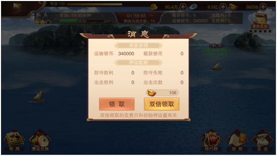 再谈最后的领取,有一个双倍领取功能,是需要消耗元宝的,但是消耗的元宝数量,其实是和玩家押运的银币数量相关,但是翻倍的收益,却把押运的银币和抢夺来的银币都翻倍,所以最佳的方案是押运2小时的船,在即将到岸前,一次性用完剩余的战斗次数,这时候再翻倍,性价比最高。