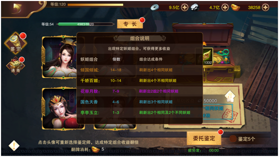 每次鉴定,都会随机出一个组合加成,高级加成是低级加成的十多倍,怎么用最小的代价,刷出最合适的组合,是玩家需要研究的策略。如果觉得刷新组合的价格太高,就可以选择“鉴定1个”进行鉴定,获得一次免费刷新的机会,同时还能重置刷新价格。