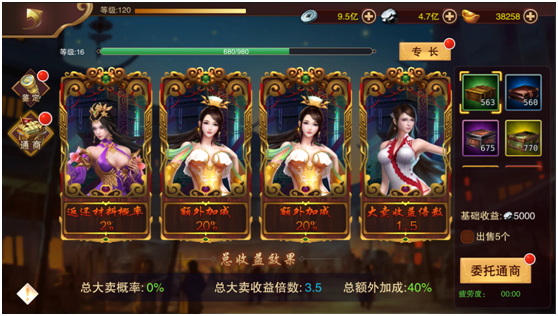 和鉴定类似,通商也有很多加成效果,但是通商不能刷新,只能通过每次通商后的自动刷新来获得不同的加成。这时候,玩家就需要收集足够的低级材料充当刷新道具,这样同样的代价,可以获得更多的资源。