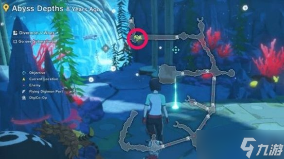 接受半鱼兽的委托后,根据指引前往附近的标记位置,与等候在此的潜艇兽会面。