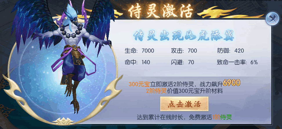 | 【开启条件】 侍灵系统是游戏内人物提升实力的重要功能,创角13日后即可激活花300元宝可以激活2阶侍灵;也可在创角色13天后在线时间达到30小时时激活1阶侍灵。