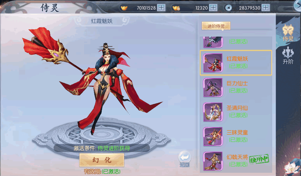 【显示规则】 在侍灵系统中点击幻化,选取已激活的侍灵形象进行幻化操作,侍灵形象会变为相应形象显示。