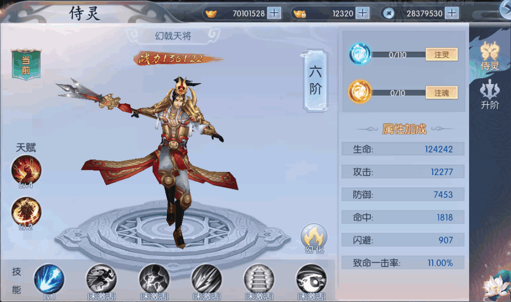 【主要玩法】 侍灵形象是可以消耗侍灵进阶石进行升阶的,每一阶都有不同的形象,共拥有8个侍灵技能,2个主动侍灵技能和6个被动侍灵技能。需阶数达到要求通过技能书进行激活,另外,通过侍灵进阶还可以给人物带来大量的属性加成,极大地增强自身的实力,可谓是颜值与实力并存!