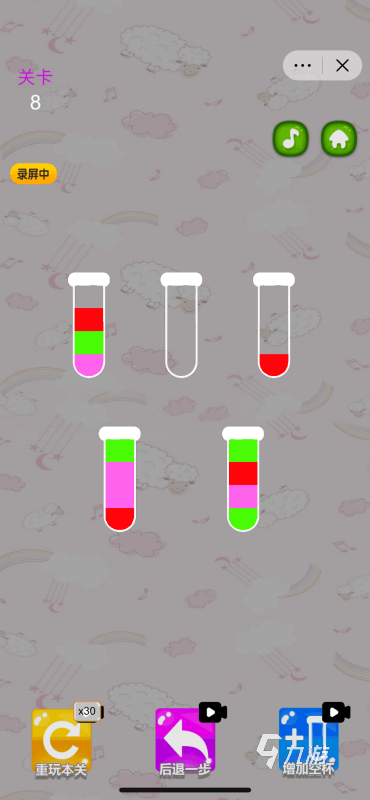 基本的操作规则的玩法方式还是会非常的特别,游戏内我们倒是可以感受到解谜益智的独特挑战,在这里你们可以尝试到难度逐渐提升的玩法感受,《彩色水排序大师》这款手游中我们需要不断的反复尝试,才能够有通关的希望,尤其是到了后面的关卡,颜色会越来越多,而瓶子却会越来越少。
