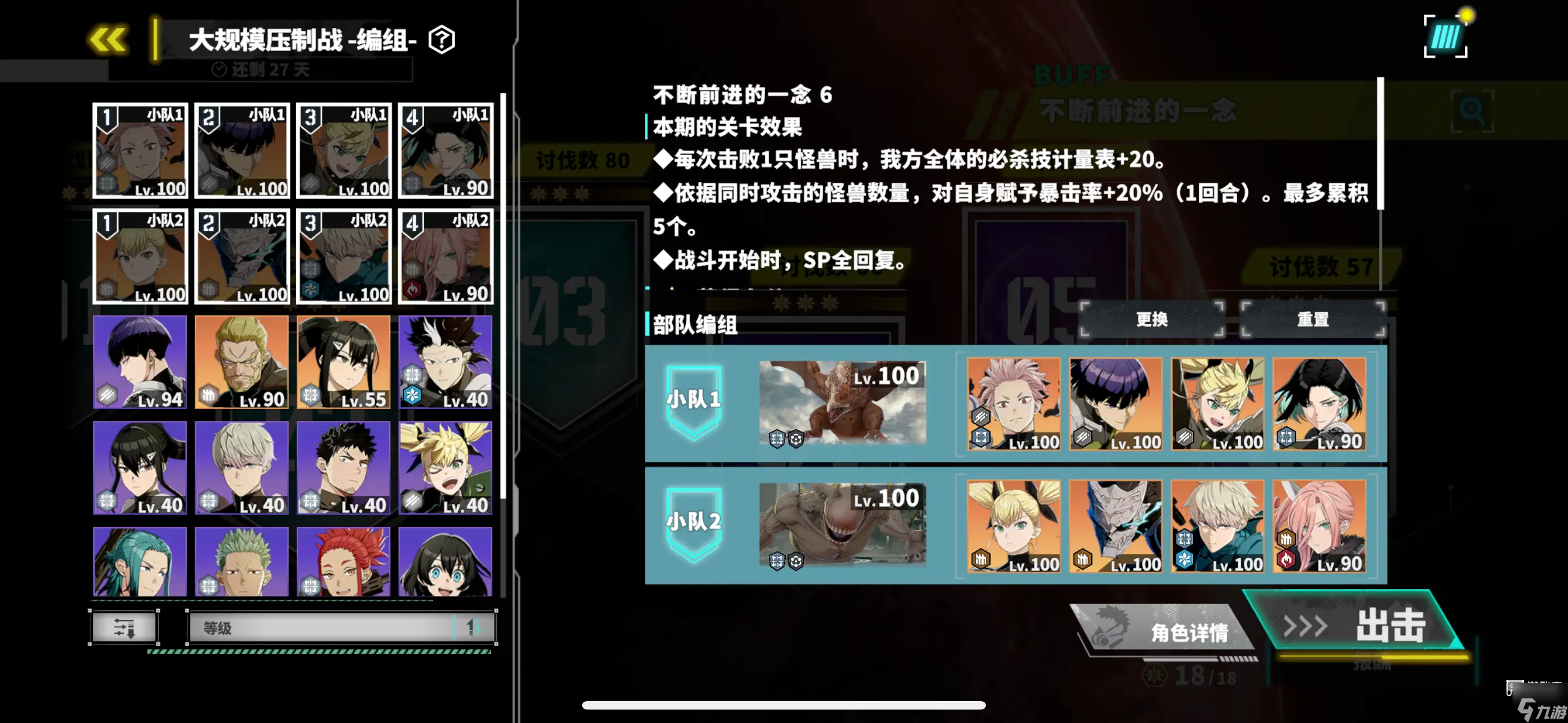 4、这次袭击战分上下两个阶段,第一关是小怪众多,需要搭配具备群攻能力的角色,而且要尽量去破核。只要每个角色破一次核,另外队友进行追击,那么大招就会快速充满,以这个方式完成第一小关的结算。