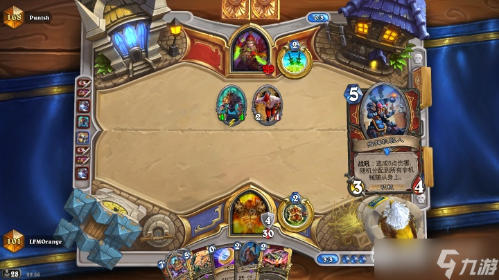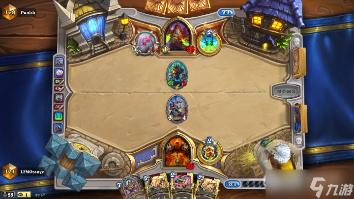 但是对面打的非常细,没有吝啬刺骨,而是选择打掉了银行家,对面随从一共6血,534留了暴徒。这时候我的手牌已经非常差了,必须要想办法(神抽)稳住节奏。