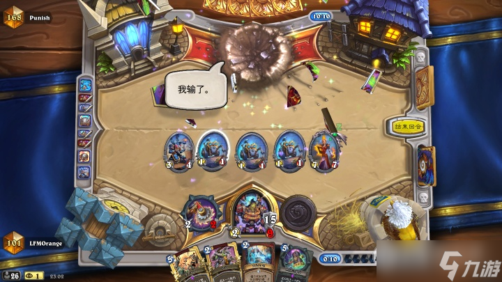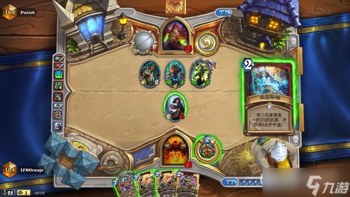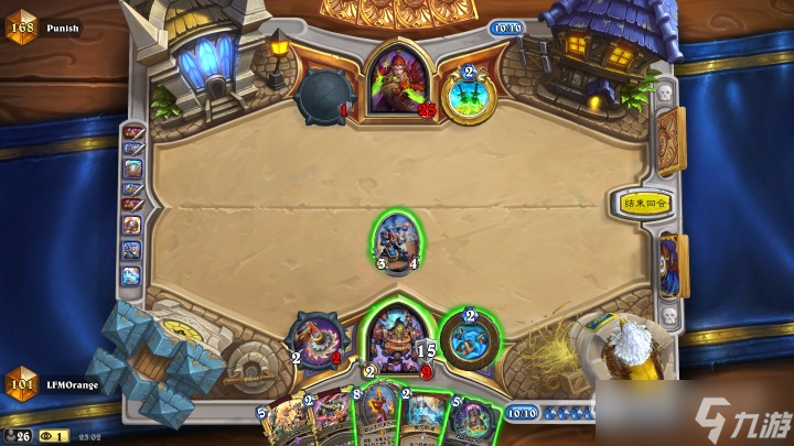 这一回合我们的节奏也出现了断档,观察对面贼一直留了部分牌没有打,推测可能有一些需要配合的爆发,例如迈拉、诺米等等,这时候防战手牌差十分危险,就要攻防转换,果断拍下877站场给压力: