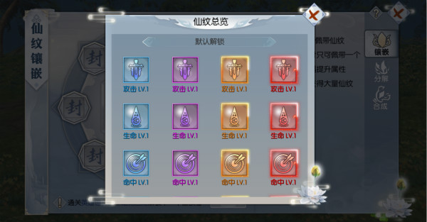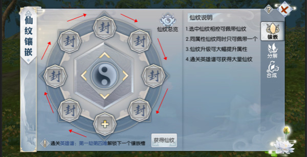 1. 通关更高层数的英雄谱可以解锁更多的仙纹类型和仙纹镶嵌槽。