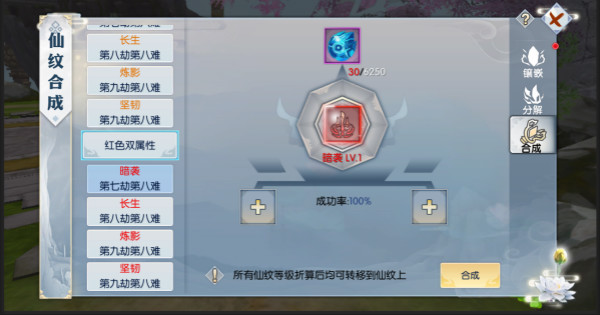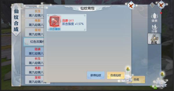 6. 仙纹合成可将两个单属性的仙纹合成为一个双属性的仙纹,需要消耗仙纹精魄,仙纹精魄可通过仙纹寻宝十次获得,也可以在仙纹宝箱中获得。暗袭仙纹可以由攻击仙纹和迅捷仙纹合成,拥有攻击与攻击强度双属性;长生仙纹可以由生命仙纹和命元仙纹合成,拥有生命与基础生命双属性,炼影仙纹可以由经验仙纹和影击仙纹合成,拥有经验加成与最终攻击双属性;坚韧仙纹可以由仙盾仙纹和防御仙纹合成,拥有防御与最终防御双属性。以上四种双属性仙纹可以通过合成获得,但是杀戮双属性仙纹只能通过仙纹寻宝获得。