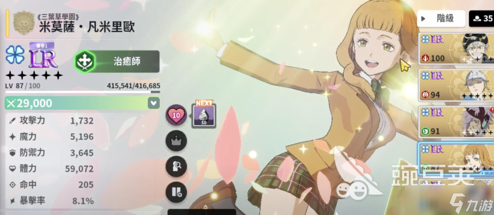 在黑色四叶草这款游戏里面,大家如果想要用治愈定位的角色,那么本期为大家推荐的这个治愈角色是大家一定要用到的,而且她在本身的品质上面也达到了SSR的品质,黑色四叶草魔法帝之道米莫萨怎么样就是本期主题,游戏当中的米莫萨是一个出身高贵的少女,并且个人魅力也是很强的,在原版当中莫萨就是一个人气非常高的角色,在游戏制作当中,她的技能其实就是主要是放在续航定位上面的。