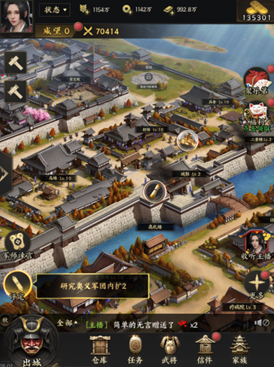 在游戏中,玩家的主城包含各式建筑,每个建筑都根据当时的历史进行了还原。每个建筑都拥有各自的功能,玩家可以这些建筑去执行各项内政事务,其中包含练兵场、家宝殿、射场、马场、兵舍、商人町、见世棚、访将所等等。游戏内政中的每个分类内容都十分丰富,就拿其中的学问所来说,在里面玩家可以研究各种不同的奥义,类似于科技树,可以全方面提升玩家在军事、资源、城池等各方面的实力,对玩家攻城略地和发展经济的影响十分巨大。