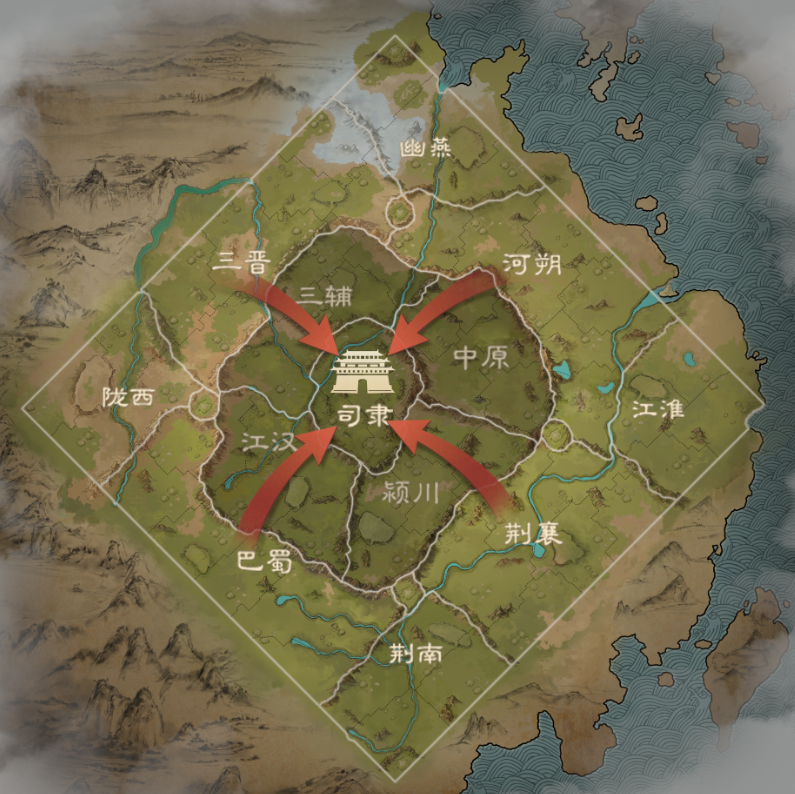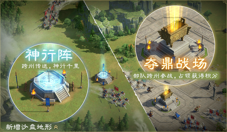 大地图上将新增多个“夺鼎战场”,分布在出不同出生州/资源州的交界。通过占领关隘或神行阵可进入夺鼎战场。