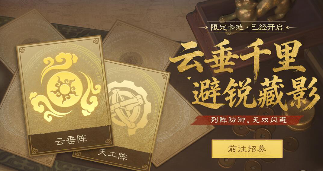云垂阵:激活此阵,部队有概率触发【闪避】状态,在此状态下将完全免疫普攻伤害及判定,是对抗主流普攻队伍的终极手段。
