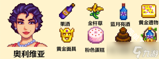 5、奥利维亚:果酒、金杆草、蓝月亮酒、黄金遗物、黄金面具、粉色蛋糕、巧克力蛋糕、陈酿蓝月亮