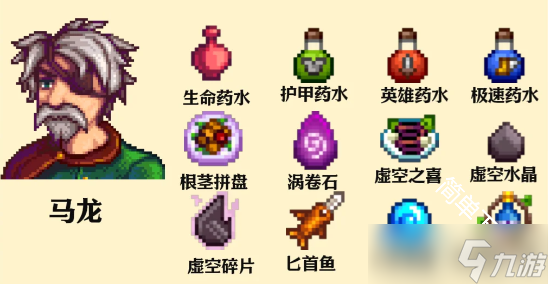 2、兰斯:陈酿蓝月亮、虚空碎片、热带咖喱、涡卷石、鱼类鳟鱼、华丽财宝箱、怪物蘑菇、匕首鱼、绿色蘑菇、银河之魂