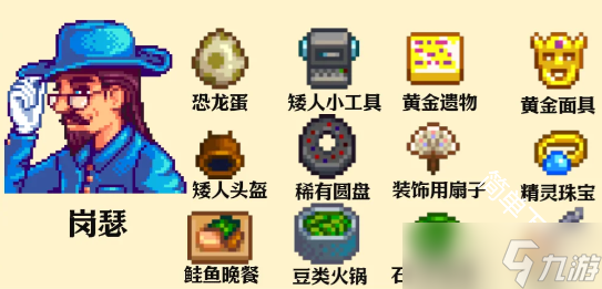 15、岗瑟:恐龙蛋、矮人小工具、黄金遗物、黄金面具、矮人头盔、稀有圆盘、装饰用扇子、精灵珠宝、鲑鱼晚餐、豆类火锅、石化史莱姆、古剑