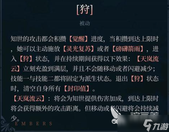 知世的被动叫做狩,就是在攻击的时候只要达到了一定的觉醒进度,那么此时积攒达到上限数量的时候,她就可以主动释放灵光复苏的技能,或者是使用磅礴剑雨这个技能,此时的话就会进入这个被动的状态,也就是狩状态里面,只要是在这个被动状态里面,知世就可以获取天岚流云的效果,这个状态会立刻冲到满层的效果,并且不会随着角色移动或者是闪避来减少数值,技能1以及技能2的话,此时都会变成派生状态。