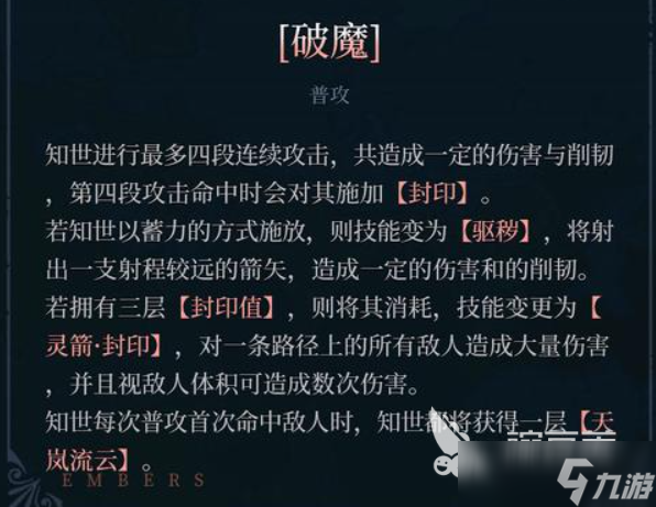 削刃效果之后还可以根据封印的层数带来额外的效果,如果此时敌人身上已经拥有了3层封印数值的话,那么可以消耗这个技能来变更为灵箭封印的效果,这个封印是可以对一条路径上所有触发到的敌人都造成伤害的,而且带来的伤害数值是数次伤害,如果敌人体积越大的话,这里带来的伤害数值更高,而且只是在每一次普攻都命中敌人的时候,就会获取一层天岚流云的状态加成。