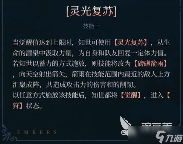 她的技能3叫做灵光复苏,也就是在觉醒值达到一定上限之后,就可以使用这样的灵光复苏带来一定的恢复效果,这里恢复的体力数值是给自身以及队友同时进行恢复的,如果前期有蓄力的话,那么这个技能就会变成磅礴剑雨的效果,剑雨技能范围之内生效的话,对敌人都会造成一定的阵法输出,同时造成攻击力伤害和削刃的效果,这个技能在释放之后只是将进入一个觉醒的状态,也可以触发她的被动效果。