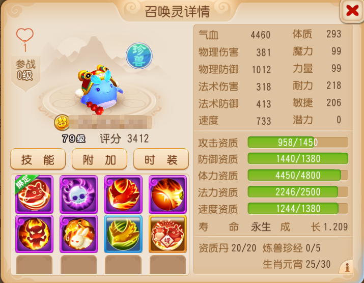 6个格子中有3个是特殊技能!这只宝宝除自身的“咕噜咕噜”有几率不受法术伤害结果外,“法术防御”及“嘲讽”两个可以同时生效的能力让其成为物法双抗的超级城墙,“高级神佑复生”“高级强壮”“高级敏捷”三本配速必要技能一本不漏,这只坦度超高的双特咕噜咕噜能否让各位少侠眼前一亮呢?