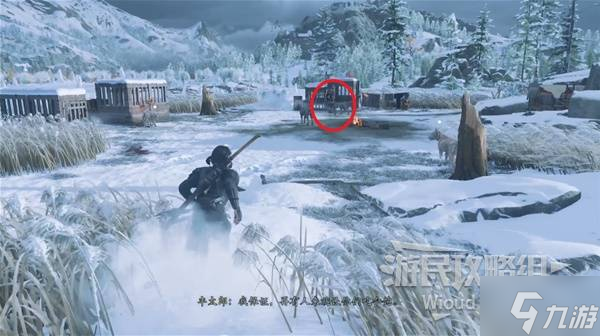 到底位置就能看到有一堆狗窝,靠近就能看到正在训狗的悬赏目标,过去直接把他干掉即可获得武器皮肤【奉太郎之牙】。