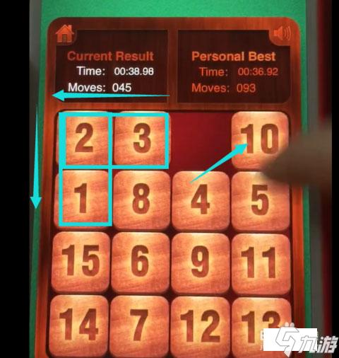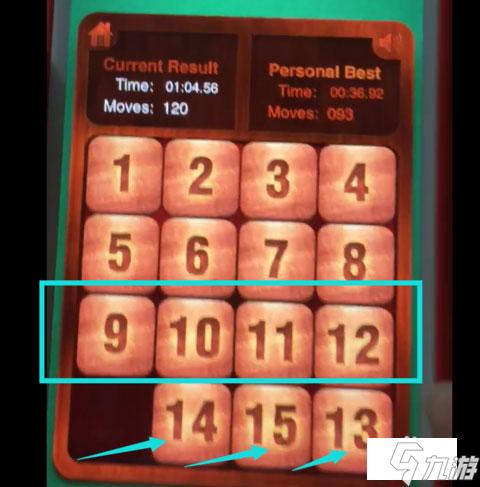 5、接着是第三行,因为需移动的数字又少了四个,所以此行很容易完成。改行排好后,如果没通关,需要排最后一行,可以看到较难操作。