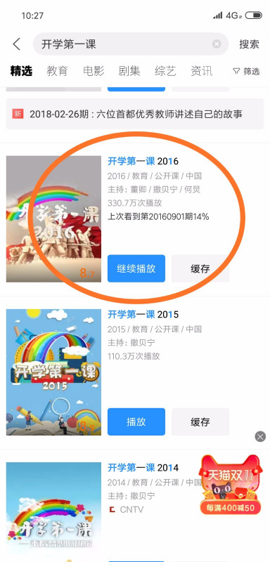 (4)在搜索结果中选择你要看的"开学*课"版本,我们以开学*课2016为例;
