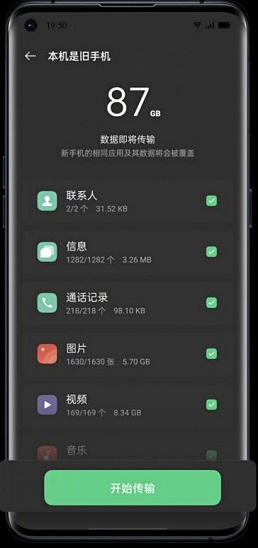 4、打开之后能看见需要迁移的数据,选择自己想迁移的数据点击确定后,等待两台手机的数据传输就行了。