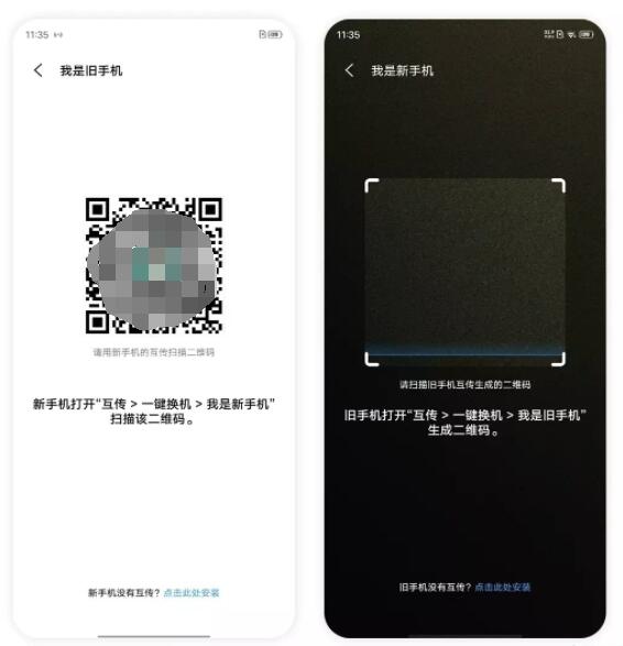4、在新手机中打开【互传】,点击【新手机】,用新手机去扫描旧手机的二维码,根据提示来完成数据迁移。