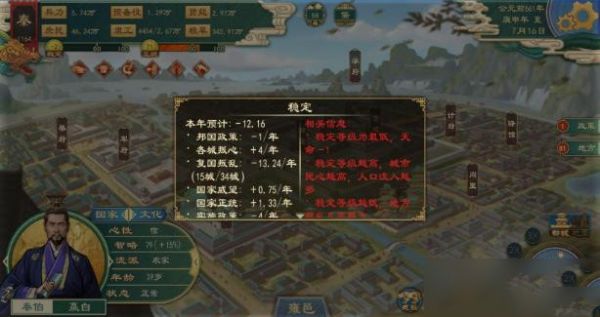 国家稳定决定国家是否会发生叛乱等负面事件,其主要影响因素为每座城邑的 骚乱、叛心、厌战 ,这三者过高国家稳定将降低,反之则提升稳定度。
