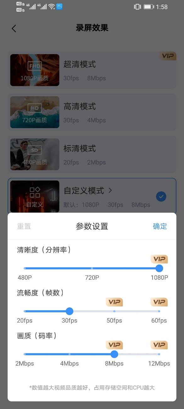 接着,就是录屏效果的设置。这里面有三种预设好的模式,大家可以根据对视频的清晰度要求来选择,最后一个是自定义模式,顾名思义就是自定义设置啦,这也许比较适合严格要求的朋友们。