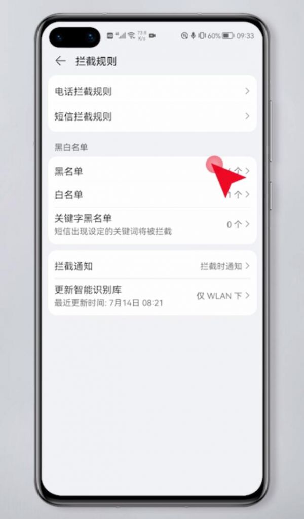 第二步打开拦截规则,进入黑名单页面,即可看到手机黑名单