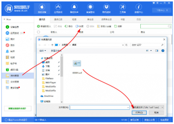 打开爱思助手,连接iPhone手机和电脑,点击资料管理——恢复,选择刚保存到电脑的vcf、csv格式文件,即可将通讯录同步到iPhone中。