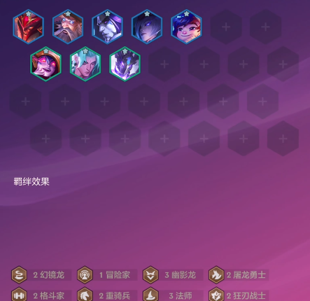 第二套由奥拉夫、瑞兹、塞拉斯、蜘蛛、努努、莉莉娅、永恩和锤石组成,可以开2幻镜龙1冒险家3幽影龙2屠龙勇士2格斗家2重骑兵3法师和2狂刃战士。这套比较适合法装多的时候玩,瑞兹和莉莉娅都可以带法装,肉装给重骑或者塞拉斯都行。等羁绊追踪者出来之后可以优先往八幻境或者8幽影走,当然也需要看具体开出的是什么纹章。