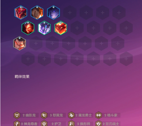 巨龙之巢开羁绊追踪者的阵容还是挺多的,因为英雄羁绊都很好搭配,不过这里只给大家推荐两种,因为其他的要么是需要高费卡,要么是阵容中热门卡太多不好D,这里推荐的两套是最好开野是最实用的。第一套由奥拉夫、斯维因、蜘蛛、布隆、锤石、慎和腕豪组成,可以开2幽影龙3怒翼龙3屠龙勇士2格斗家2神龙尊者2护卫2换型和2狂刃战士,阵容过渡也比较平滑,比较适合物理装备或者羊刀多的时候用,像斯维因和拉夫都可以C,坦克装备给布隆和锤石,羁绊追踪者出来之后可往12怒翼或者8幽影8屠龙走。