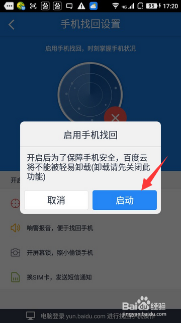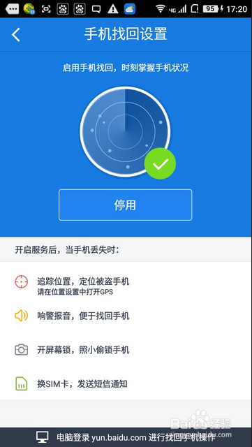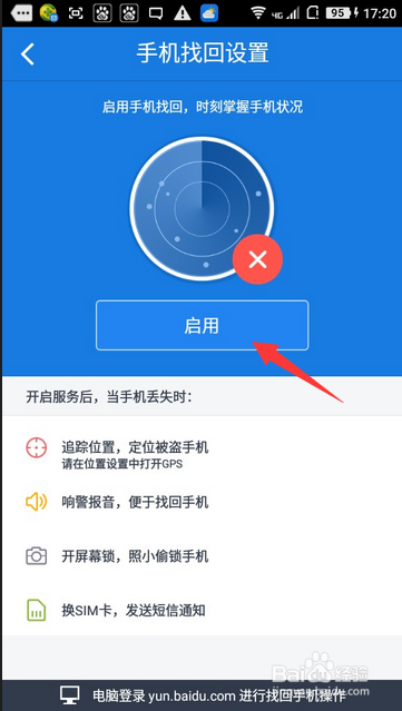 然后在手机找回设置里面按一下启用找回功能就可以了。(注意一下:启用之后别将百度云卸载掉,因为载掉百度云了就无法进行定位了。)