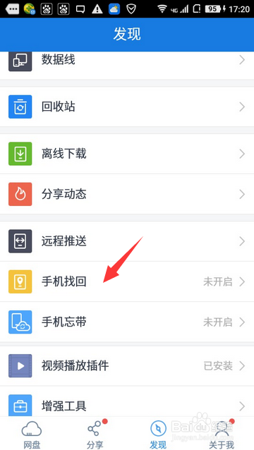 登录百度云帐户以后,再选择进入【发现】,在发现页面中,就可以看到【手机找回】选项,点击进入到里面,如下图所示。