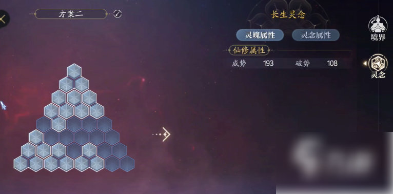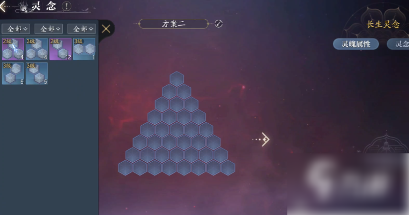 先从1-3慢慢地去升级,注意灵念是要一套一套去升级的,而不是追求其中单个的高品质高属性,有条件就都全金,不然就都全紫,一套堆叠起来增加的属性是相当可以的。灵念养成主要是消耗银元,开销还不少,但回报的属性是蛮多的,所以还是蛮推荐捣腾一下的。
