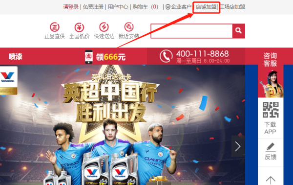 3、点击进入官网 。在首页的右上角上看到店铺加盟选项。点击。