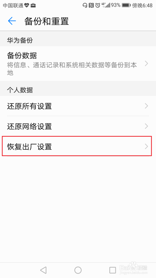 在备份和重置页面中,点击“恢复出厂设置”;