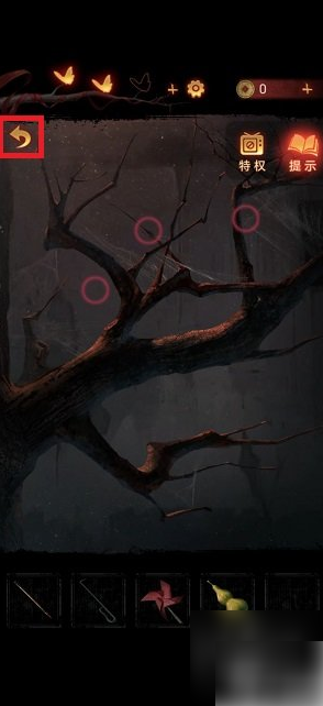 3、需要注意的是,如果你进入了下一级的画面,如下图,需要先点击左上角的“返回”再点击上图的黄箭头完成爬树。