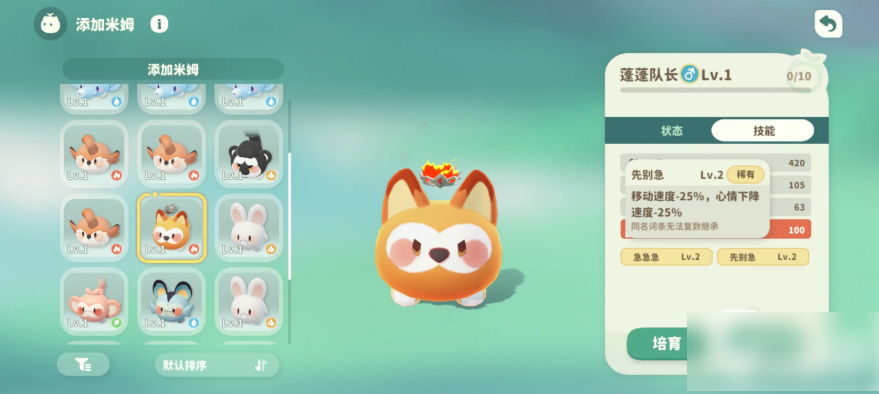 1、由于树野小岛的蓬蓬队长是火属性的,因此小编用的是20级的水系宠物【蓝蓝鼠】进行挑战,这是因为属性克制进行挑战会有额外的加成,可以很大程度提升胜率。小编的蓝蓝鼠属性只有【好战】加20攻击这个词条,因此配置相对来说是比较低的。如果大家还是打不过他的话,那么可以考虑先等角色在达到20级解锁了二级捕捉枪之后再去挑战,这是因为解锁二级捕捉枪后会新增一个加新的防御的技能,大家把回血和加防御技能都加上以后,再去打蓬蓬队长会轻松不少。