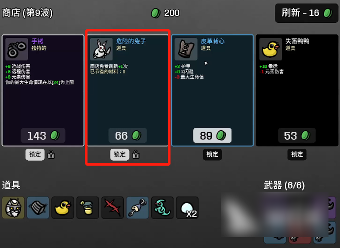 道具:特别契合cyborg的道具其实没有特别多,蓝色低品质的道具可以选择“危险的兔子”,因为它可以让你的商店进行一次免费的刷新,这个道具除了他以外,对于其他角色也都是可以拿的,因为有了它之后你就相当于可以节省很多材料,而如果通过这免费的一次刷新获得了高品质的道具那更是直接赚翻。